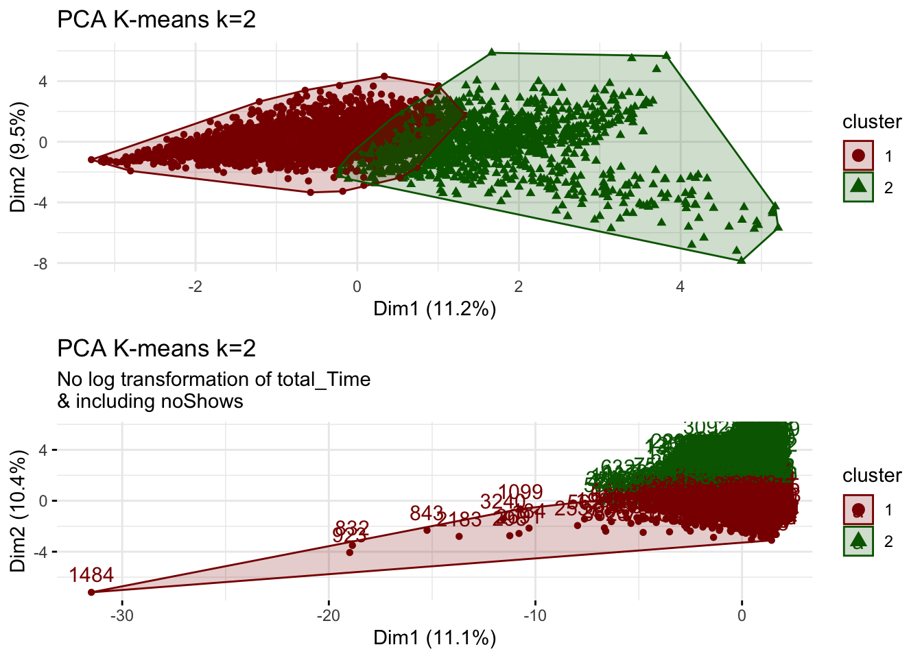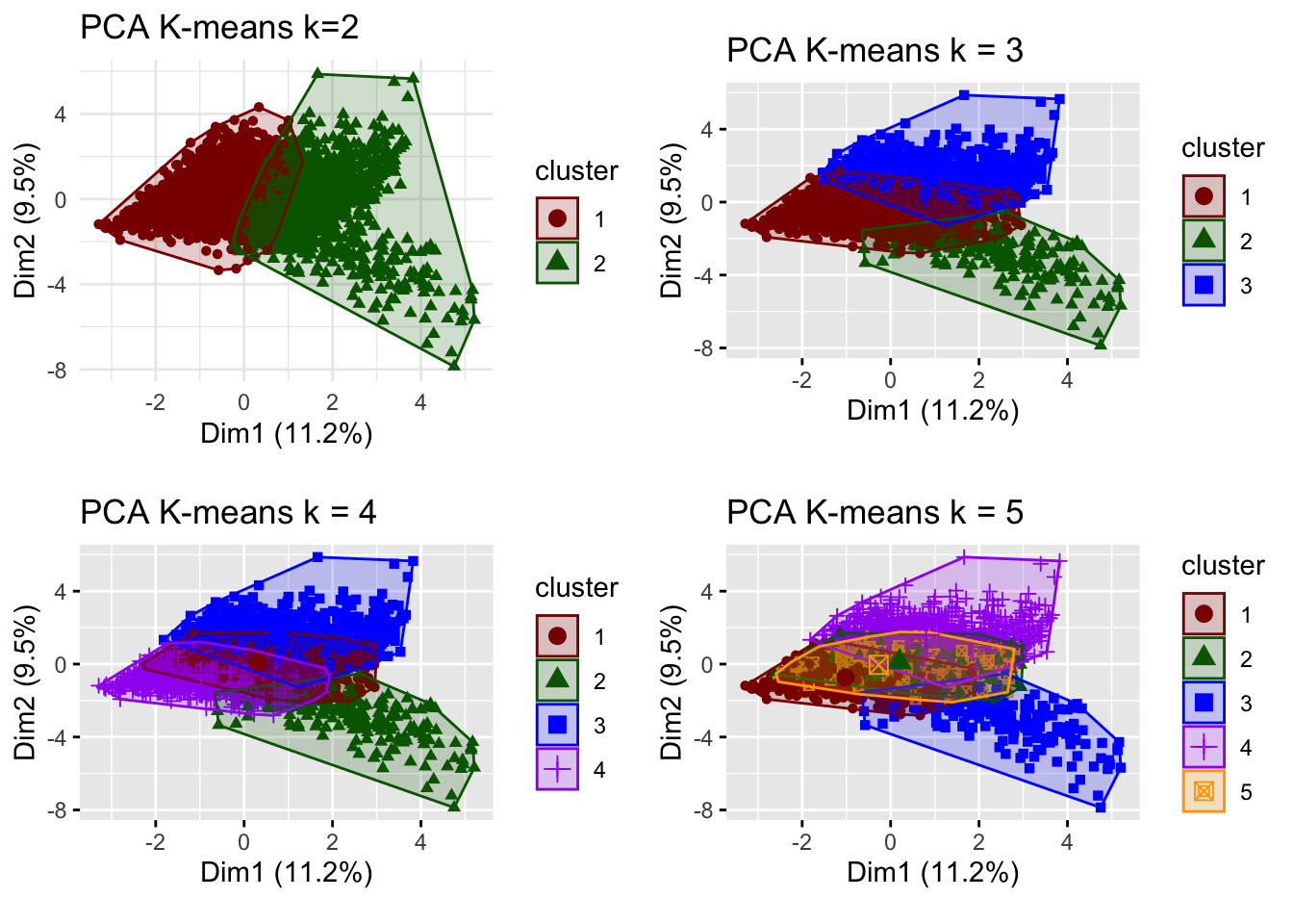 - The results sensitive to outliers as shown by the differences between kmeans and PAM