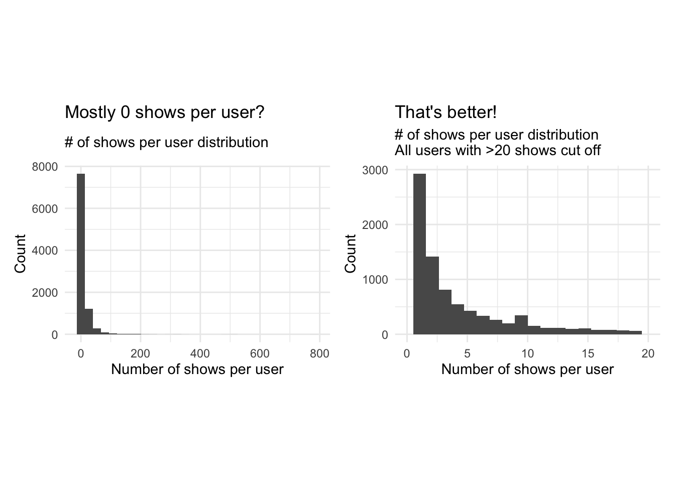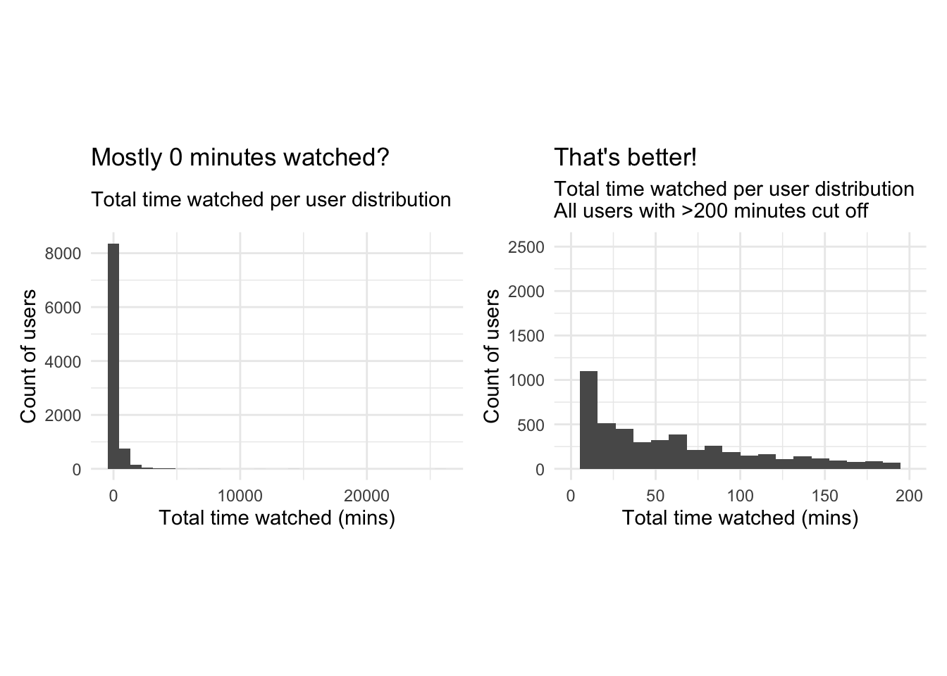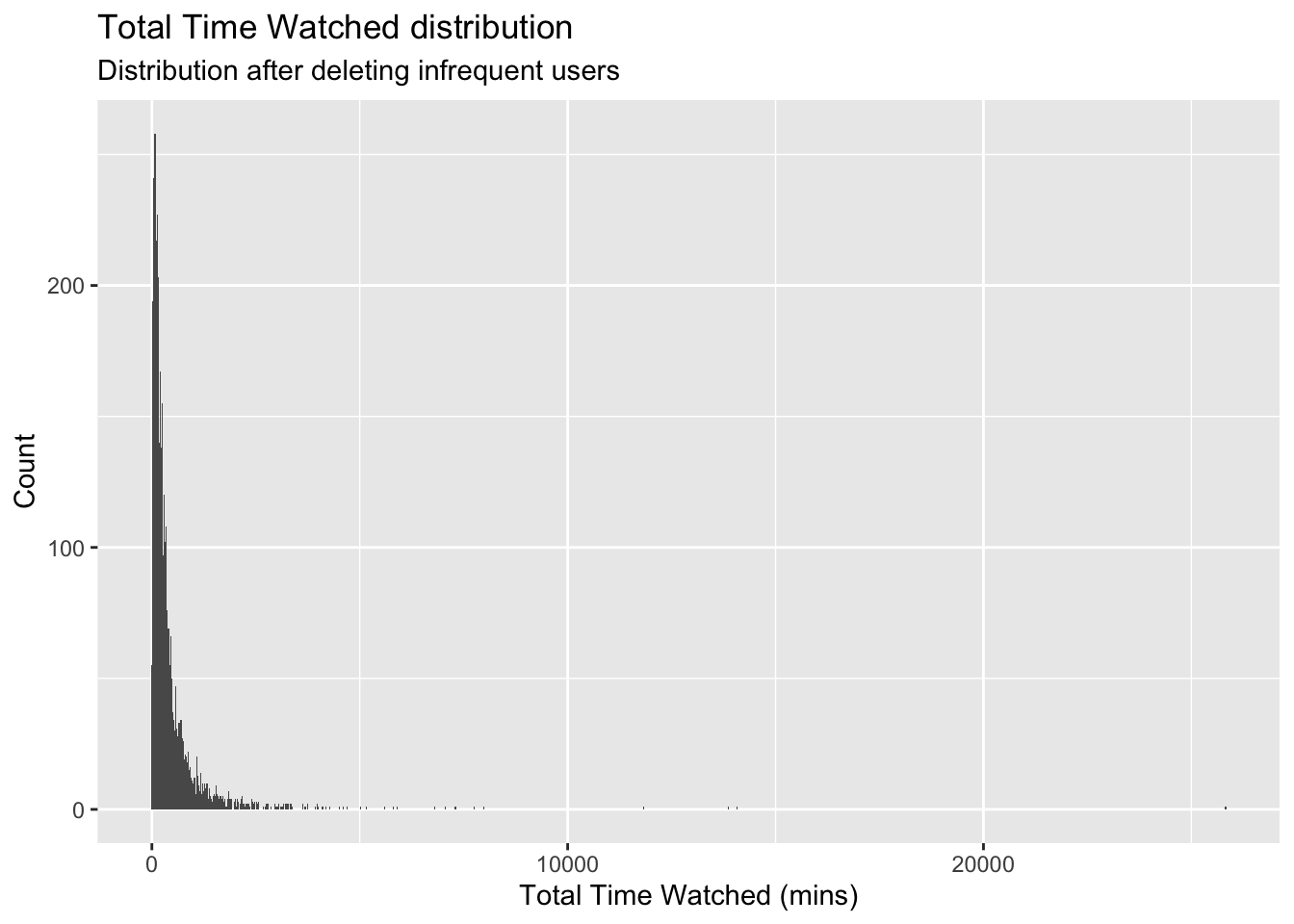 userData<-cleaned_BBC_Data %>% group_by(user_id) %>% summarise(noShows=n(), total_Time=sum(time_viewed_min))