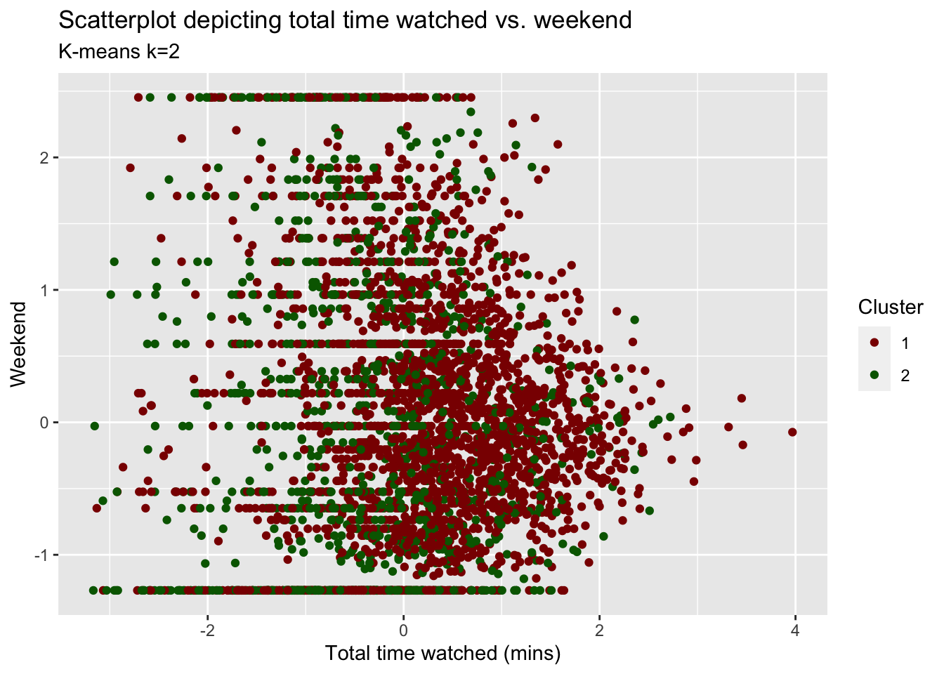 Using the ‘Average’ method yields one large cluster with 3623 observations and two tiny clusters with only one observation each. We conclude that this method is not useful at all as can also be seen in the following visualisations. Using the ‘ward.D’ method, however, yields three clusters with sizes of 2538, 915 and 172 observations per cluster. While the first two cluster relative sizes are different to the results from kmeans, we again find a smaller cluster (here 172, in kmeans 181) that describes Children viewers. For the rest of the analysis, we use H-clustering with the ward.D method to validate our findings from kmeans.
