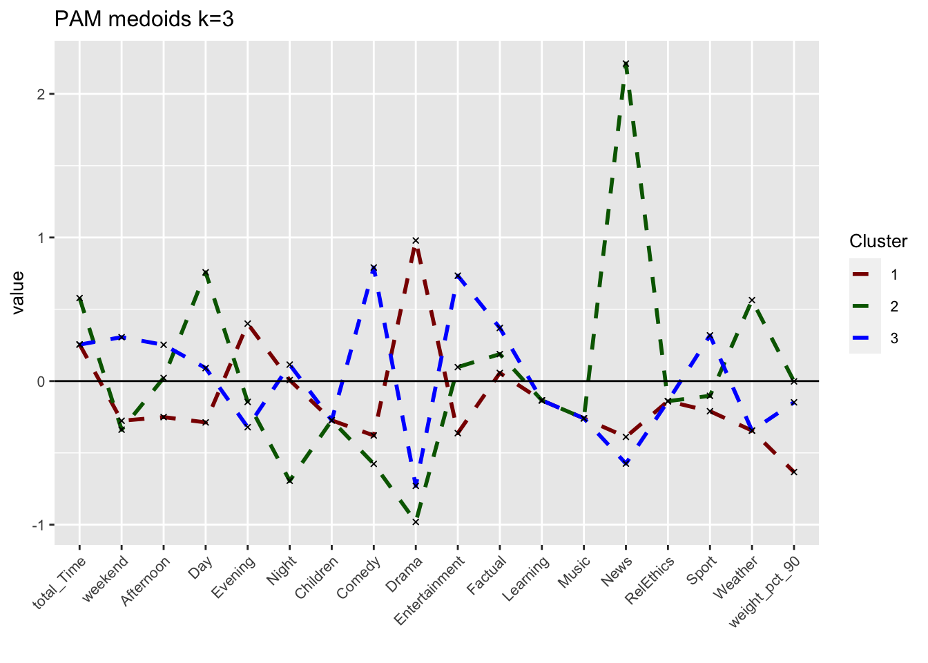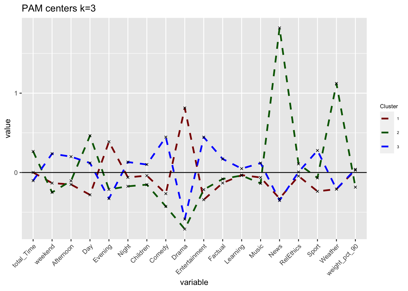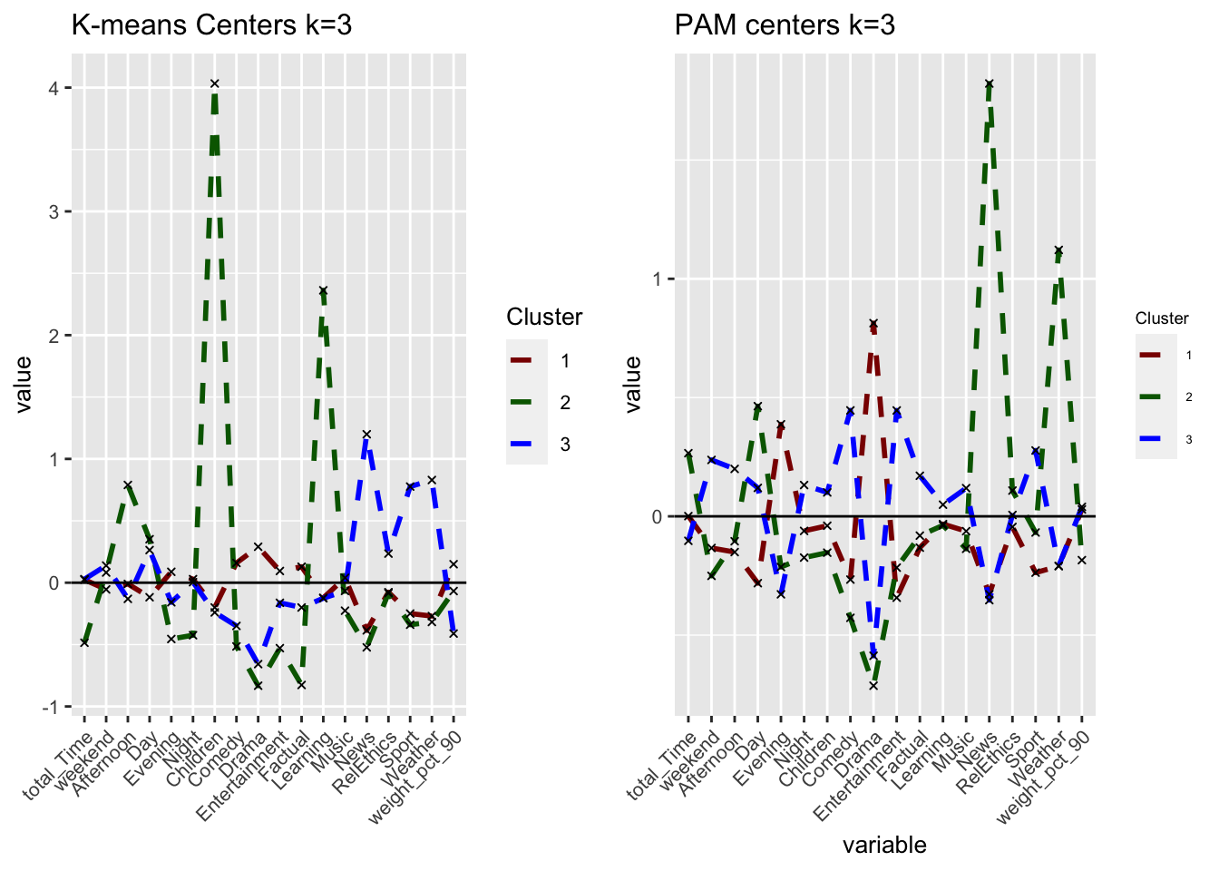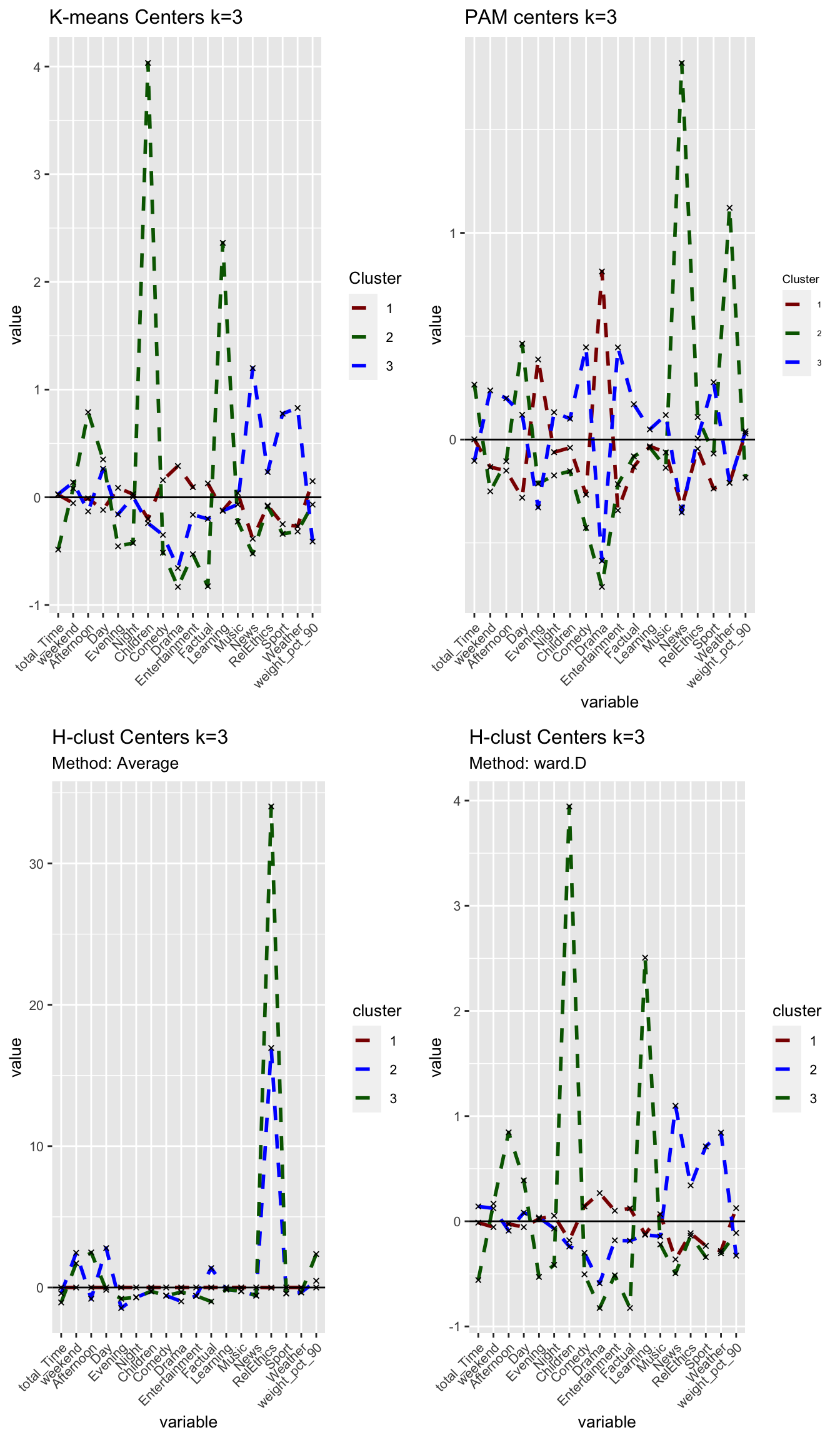 Comparing across the 3 methods, we arrive at 3 fairly distinct groups. The ward.D h-clust method, seems to validate the clusters derived by k-means analysis as we arrive at fairly similar cluster in terms of size and attributes. However, The PAM method which does yield some similarities with the K–means method, differs significantly in terms of size and influence of variables. There are various possibilities for this, one may be that the data set is filled with outliers which are obscuring our results and the PAM method is more robust in handling outliers, or perhaps the PAM method sees the very niche group of children/learning individuals as outliers and is thus grouping them to the closest group of similar daytime viewers.