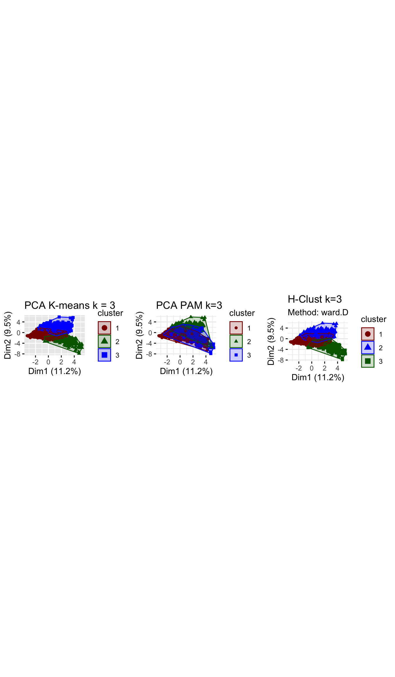 grid.arrange(plot_kmeans_3cl_pca, plot_pam_pca, plot_hcl_pca_wd, nrow = 1)