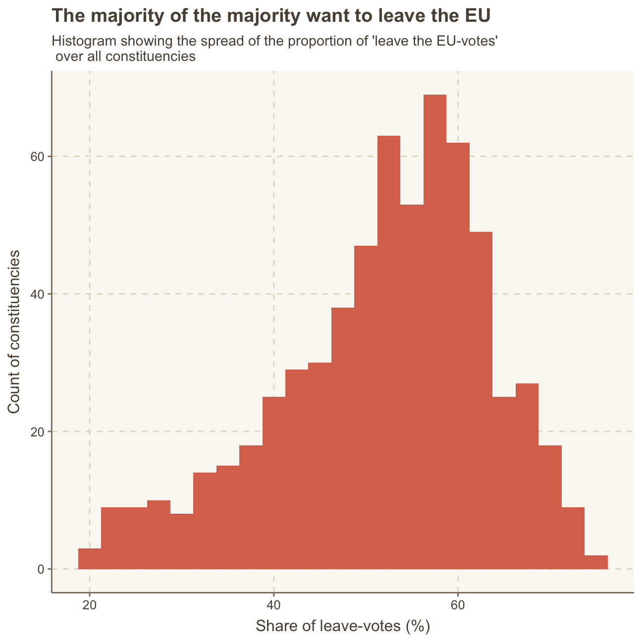 subtitle = "Histogram showing the spread of the proportion of 'leave the EU-votes'\n over all constituencies",