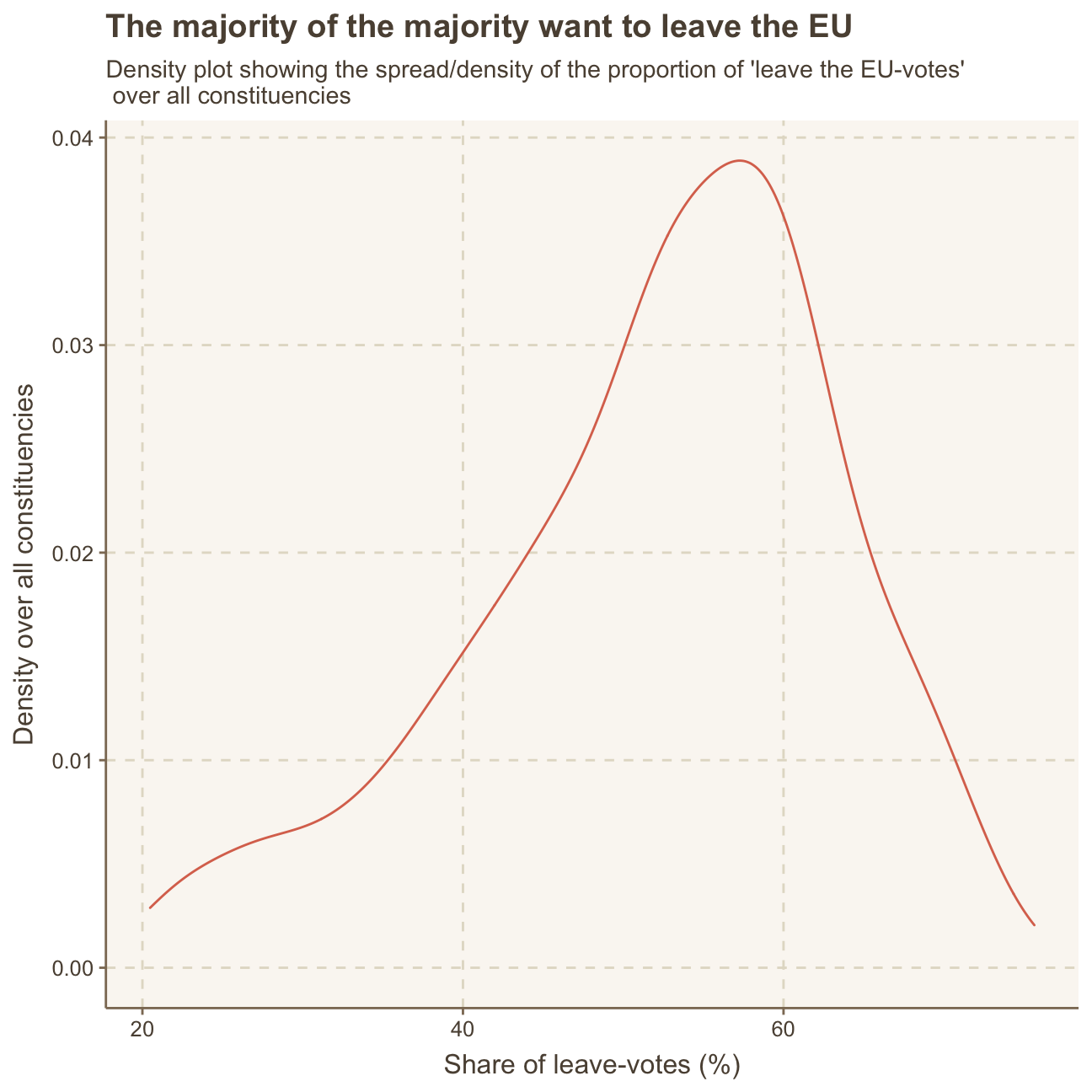 subtitle = "Density plot showing the spread/density of the proportion of 'leave the EU-votes'\n over all constituencies",