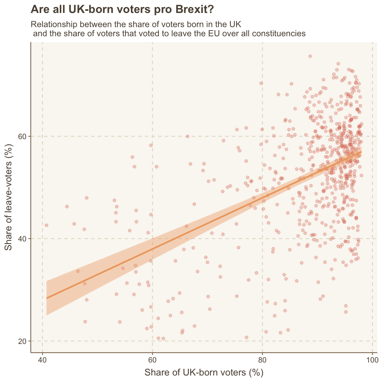 subtitle = "Relationship between the share of voters born in the UK \n and the share of voters that voted to leave the EU over all constituencies",