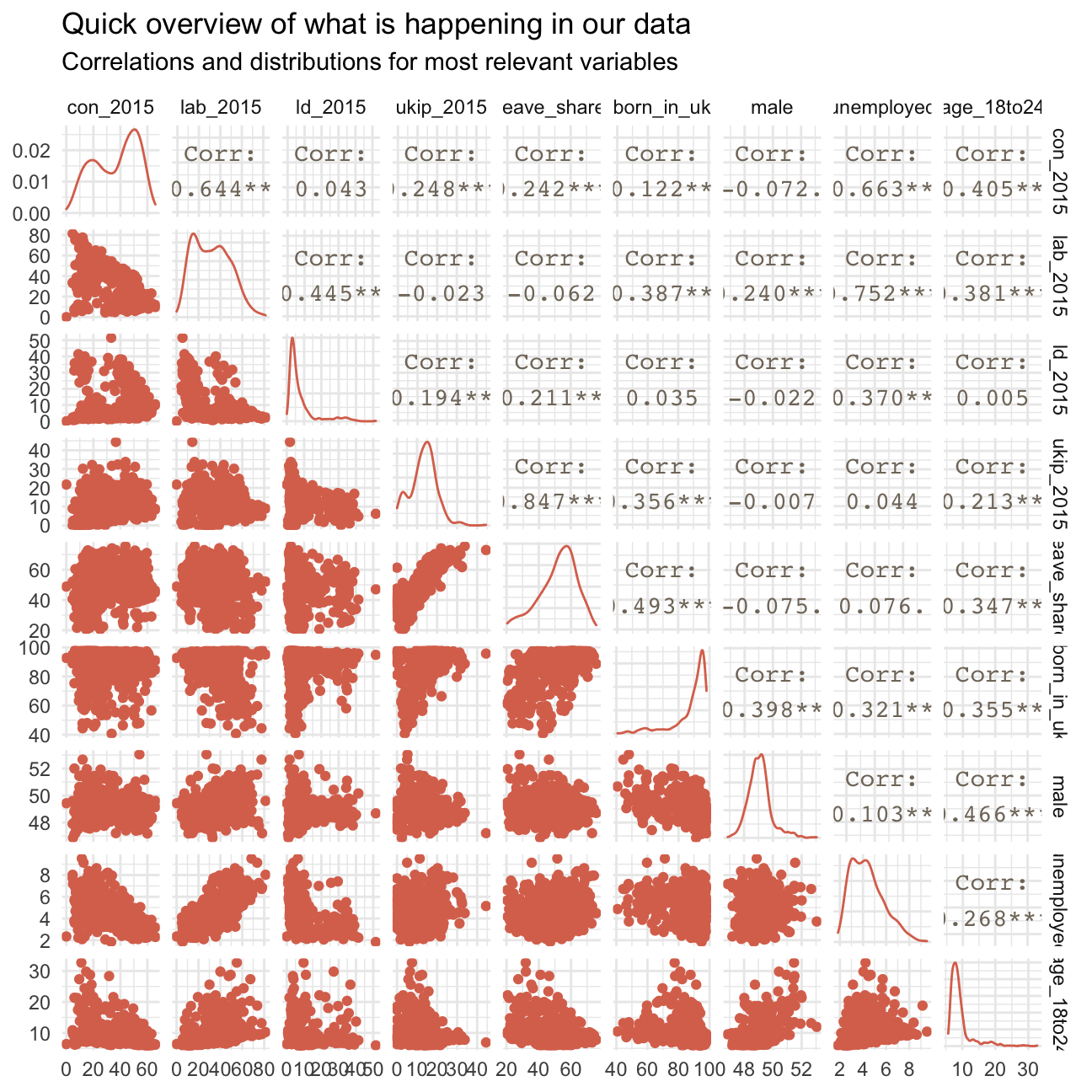 Generally, the points in the plot clearly cluster in the upper right corner, showing that most of the consitutencies consist of mainly UK-born voters and have a relatively high share of leave-voters. In the end, this was logically followed by the UK voters deciding to leave the EU.