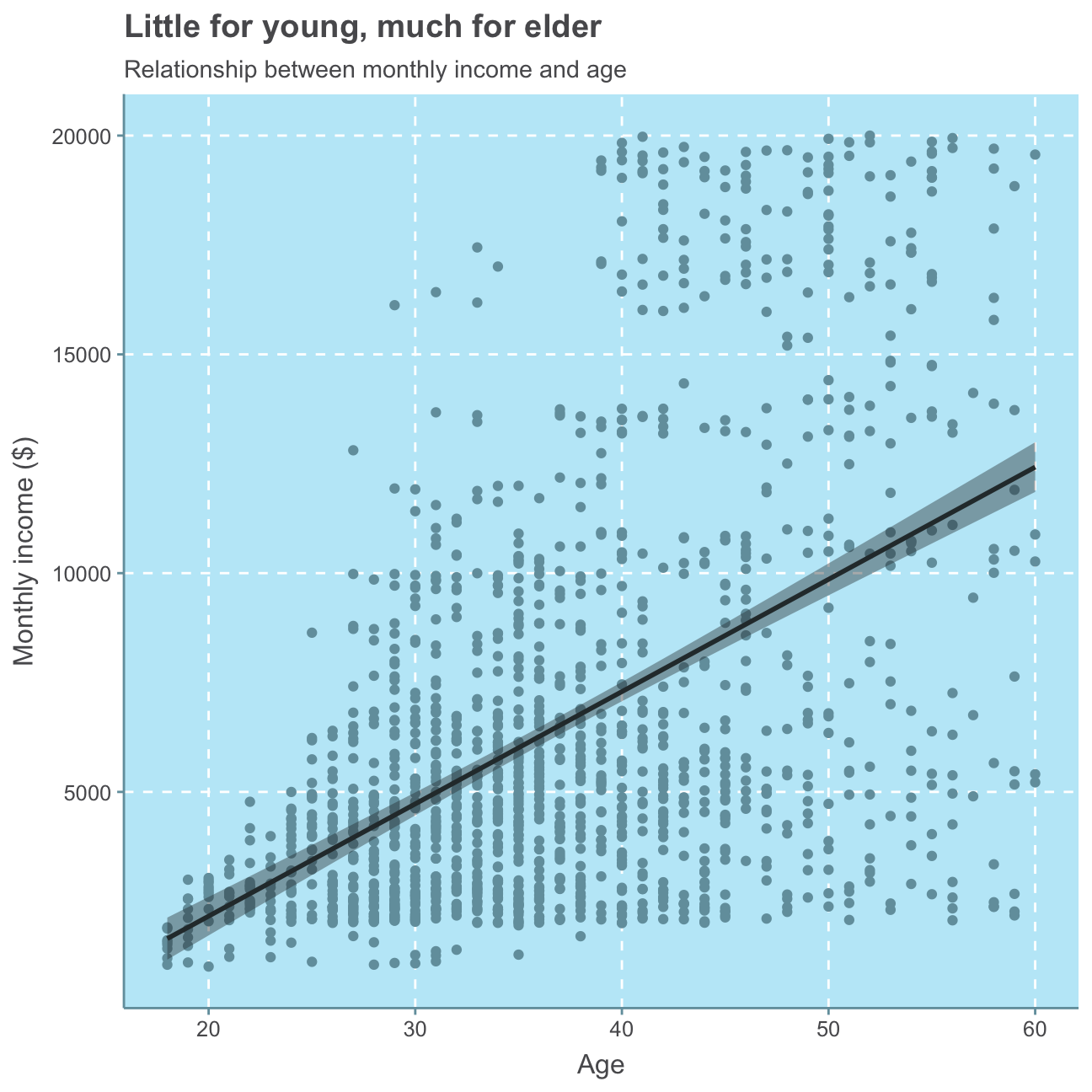 As we have already seen some indications for a relationship between age and job_role in the beginning, we will, lastly, investigate the relationship between age and monthly income.