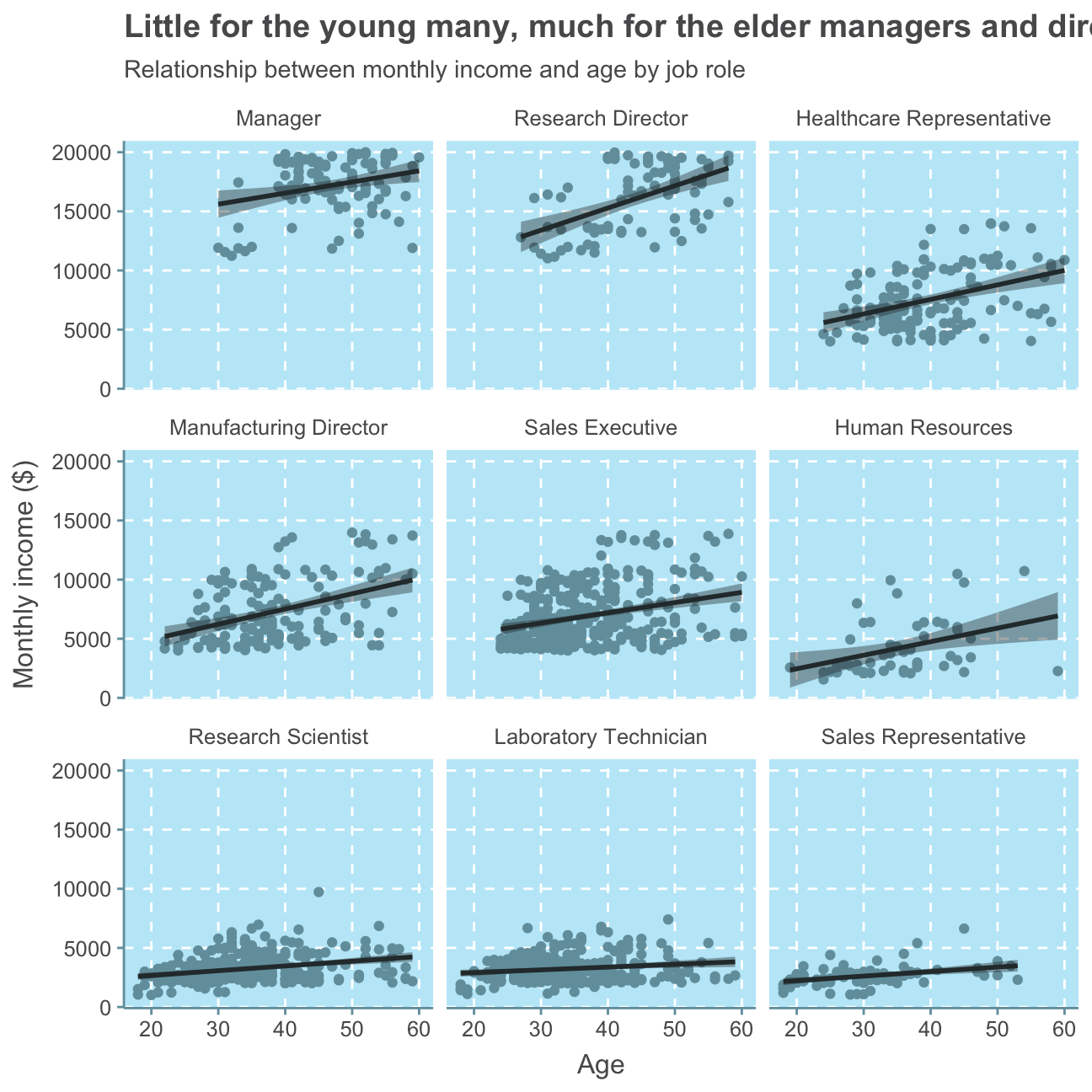 As a higher age is commonly associated with a higher (more senior) job role and consequently also a higher salary, we facet the prior plot per job role for further analysis.