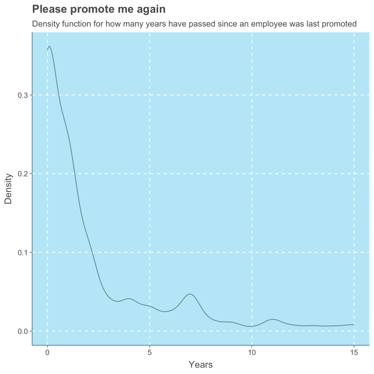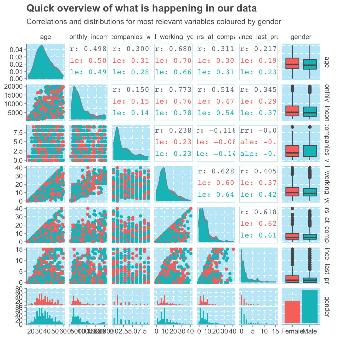 While we can observe an almost Normal distribution for the employees’ age, we find that the majority of employees has been at the company less then approx. 10 years. There are, however, a few people that have worked at the company for 20 or even over 30 years. We, further find that employees are relatively quickly promoted as for most employees, the last promotion is fewer than approx. 3 years ago while for almost no employee the last promotion is over 10 years ago. While there are a few people earning more than 10,000USD per month, the majority of employees earn below, indicating a common company structure with many low-salary jobs and only few high-salary jobs.