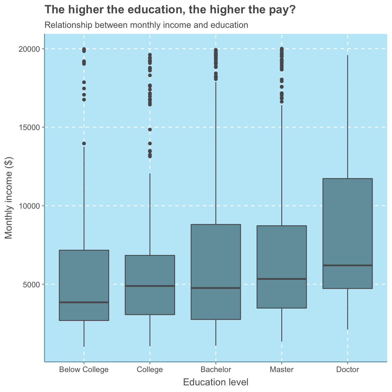 The median monthly income shows no direct positive relationship with the level of education as the median monthly income of employees with a bachelor is lower than that of people with a college degree. Nevertheless, the average (mean) monthly income shows a positive relationship with the education level as people with the lowest education level (Below College) earn the lowest monthly income on average, employees with the second lowest education level (College) earn the second lowest monthly income and so on.