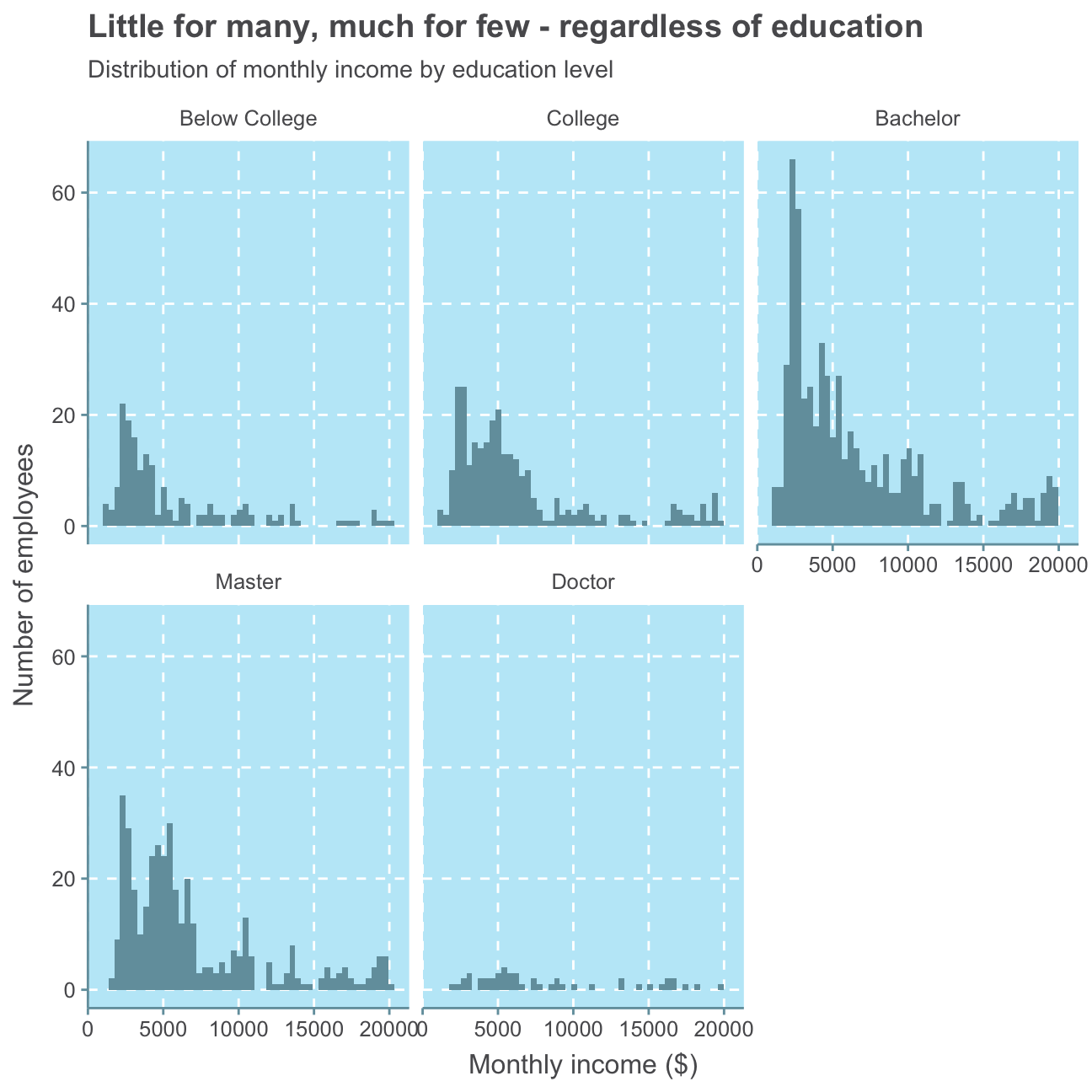Here, again, we can only observe that there are a generally more low-salary jobs than high-salary jobs. The majority of all education levels except Doctor earn below 10,000USD but there is no clear indication as to which level of education earns the least. While there are only a few employees with a Doctor, their level of monthly income varies and shows no directly connected level of income.