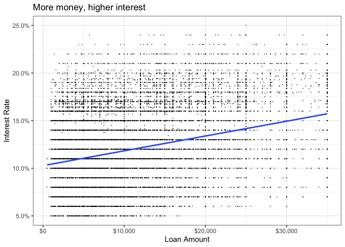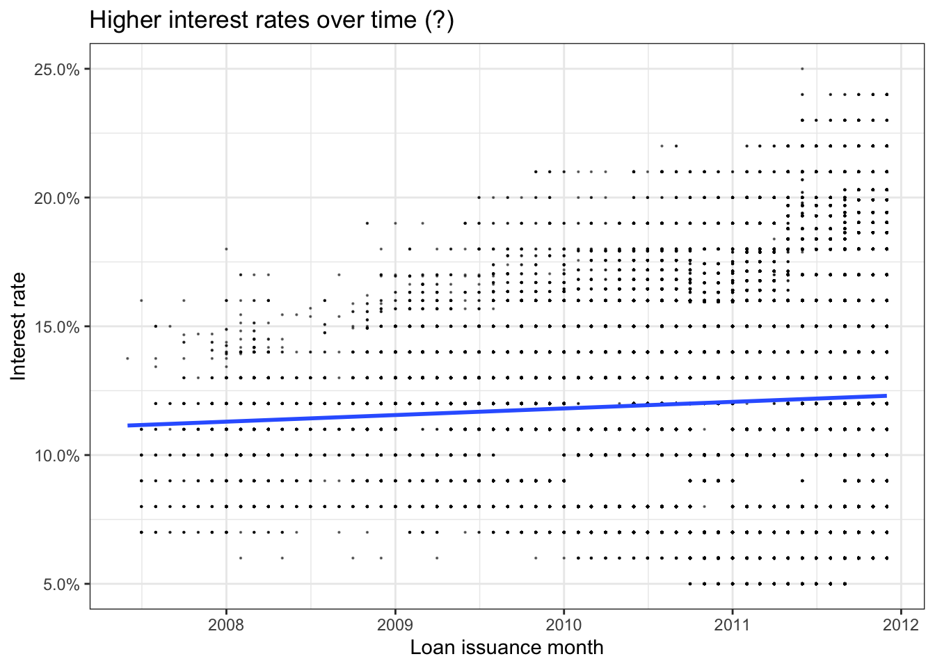 The goal of this analysis is to walk through the mechanics of designing a predictive model using linear regression. The example we will use is Lending Club, a peer-to-peer lender. The goal is to come up with an algorithm that recommends the interest rate to charge to new loans. The lending club has made historical data publicly available and we will use it for this exercise.